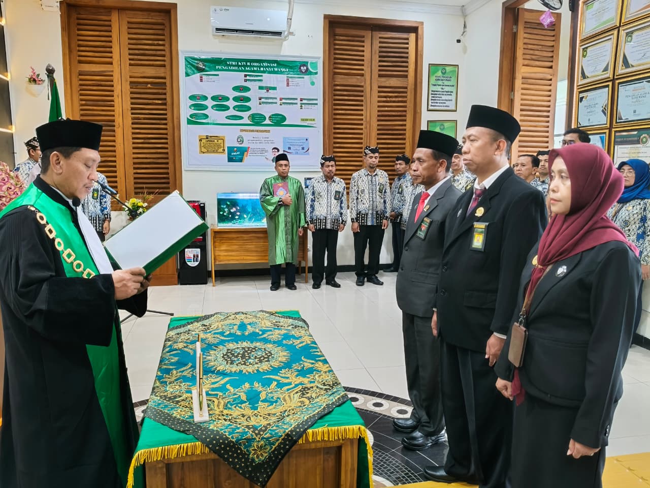 Pengadilan Agama Banyuwangi melaksanakan pelantikan dan pengambilan sumpah jabatan Panitera baru, Drs. Syaifullah, S.H., M.H., pada Kamis, 31 Juli 2025. Pelantikan dipimpin langsung oleh Ketua PA Banyuwangi, Ahmad Rifai, S.Ag., M.H.I. Acara ini dirangkaikan dengan serah terima jabatan dari Panitera lama, M. Nidzam Fickry, S.H. Kegiatan berlangsung khidmat di ruang sidang utama dengan dihadiri seluruh aparatur PA Banyuwangi.