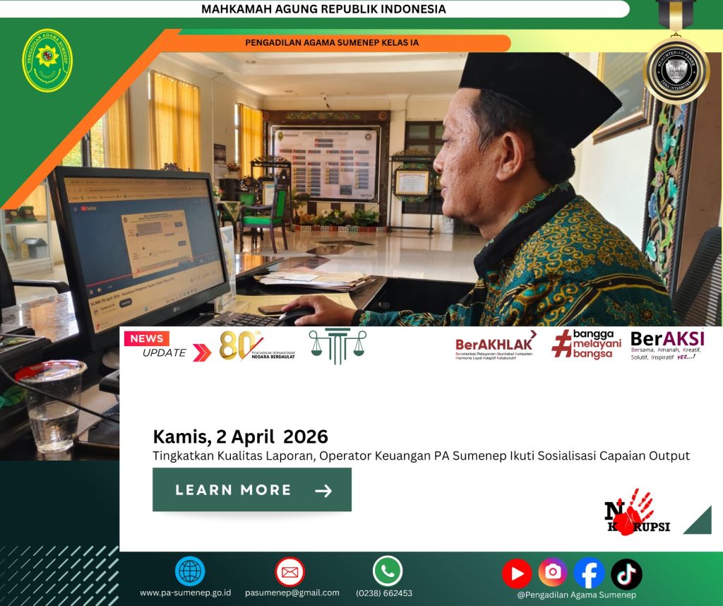 pa-sumenep.go.id – Pengadilan Agama Sumenep terus menunjukkan komitmennya dalam meningkatkan kualitas laporan keuangan dengan mengikuti Sosialisasi Capaian Output yang diselenggarakan oleh Kementerian Keuangan Republik Indonesia secara daring pada Kamis, 2 April 2026. Kegiatan ini diikuti oleh operator keuangan sebagai upaya memperkuat pemahaman terhadap pelaporan berbasis kinerja yang akuntabel dan transparan. “Kualitas laporan bukan hanya angka, tetapi cerminan tanggung jawab dan integritas,” menjadi kutipan yang menggambarkan semangat peserta dalam kegiatan tersebut.