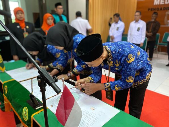Ketua Pengadilan Agama Malang, Bapak Drs. H. Misbah, M.H.I., memimpin pengambilan sumpah ketiga CPNS tersebut yang juga dihadiri oleh pegawai PA Malang serta keluarga dari pegawai yang dilantik. Rangkaian acara inti dilanjutkan dengan pembacaan Surat Keputusan Ketua Pengadilan Tinggi Agama Surabaya oleh Analis Kepegawaian Ahli Pertama PA Malang. Selanjutnya prosesi pembacaan dan penandatanganan Pakta Integritas oleh pegawai yang dilantik.