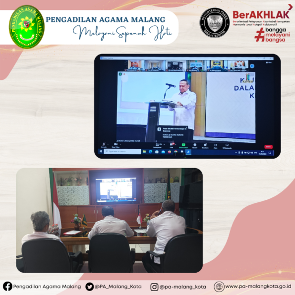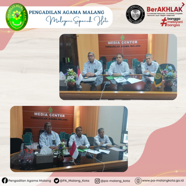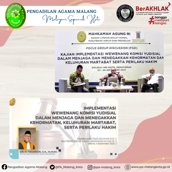 Senin, 04 September 2023, pukul 08.30 WIB, Ketua Pengadilan Agama Malang, Wakil Ketua dan Hakim pengadilan Agama Malang mengikuti kegiatan Focus Group Discussion (FGD) penyusunan naskah kajian secara virtual melalui zoom meeting. Berdasar surat undangan Kepala Puslitbang Hukum dan Peradilan Mahkamah Agung RI nomor 1594/Bld.2/Lit/S/8/2023 tanggal 29 Agustus 2023, PA Malang memenuhi undangan tersebut. Kegiatan FGD kali ini berjudul “Implementasi Wewenang Komisi Yudisial dalam Menjaga dan Menegakkan Kehormatan dan Keluhuran Martabat serta Perilaku Hakim” yang diikuti oleh seluruh Hakim Tingkat Banding dan Tingkat Pertama pada empat lingkungan peradilan secara virtual.